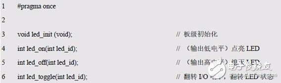 電阻R3、R4 的作用是防止產(chǎn)生過電流而燒壞LED,這是由電源電壓和LED 的額定電流決定的LED 電學(xué)特性而接入的,當(dāng)LED 的電壓超過1.5V 時,電流將急劇增加,所以必須避免出現(xiàn)這樣的情況。在數(shù)字電路中,當(dāng)輸出為高電位時,則電流流到負載上;當(dāng)輸出為低電位時,則從負載一側(cè)吸入電流。前者的電流叫作源電流,后者叫作吸收電流。顯然LED只有點亮、熄滅和翻轉(zhuǎn)3 種操作,可以直接調(diào)用接口函數(shù)實現(xiàn),led.h 接口文件的內(nèi)容詳見程序清單4.1(各接口具體的實現(xiàn)在第4 章中會詳細介紹)。