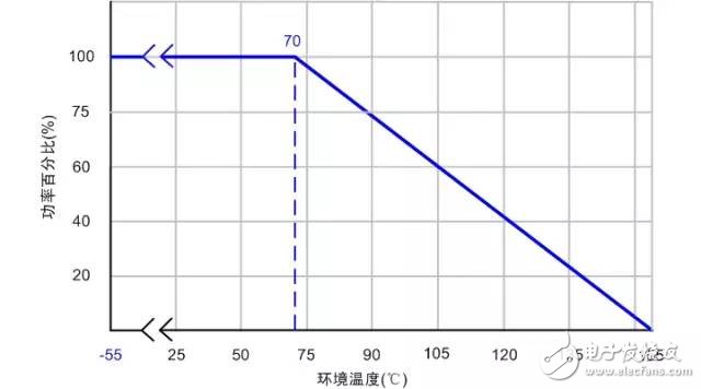 而最大工作電壓是在額定功率下,該電阻可以承受的最大電壓。但是要注意!看下面這個(gè)圖??梢钥闯鲱~定功率是在最高環(huán)境溫度70度的條件下標(biāo)注的(不同廠家,系列可能有微小區(qū)別,在設(shè)計(jì)之初和問題查找的時(shí)候應(yīng)該核實(shí)清楚。)