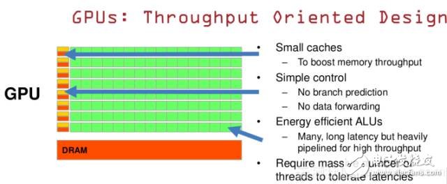 GPU雖然有dram延時,卻有非常多的ALU和非常多的Thread,為了平衡內(nèi)存延時的問題,我們可以中充分利用多的ALU的特性達(dá)到一個非常大的吞吐量的效果。盡可能多的分配Threads。通常來看GPU ALU會有非常重的pipeline就是因為這樣。所以CPU擅長邏輯控制,串行的運(yùn)算。和通用類型數(shù)據(jù)運(yùn)算不同,GPU擅長的是大規(guī)模并發(fā)計算,這也正是密碼破解等所需要的。所以GPU除了圖像處理,也越來越多的參與到計算當(dāng)中來。