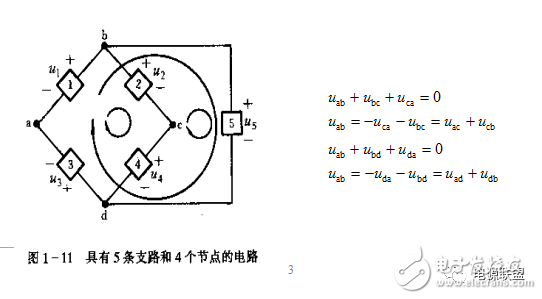 KVL可以從由支路組成的回路,推廣到任一閉合的結點序列,即在任一時刻,沿任一閉合結點序列的各段電壓(不一定是支路電壓)的代數(shù)和等于零。對圖l11電路中閉合結點序列abcaabda列出的KVL方程分別為: