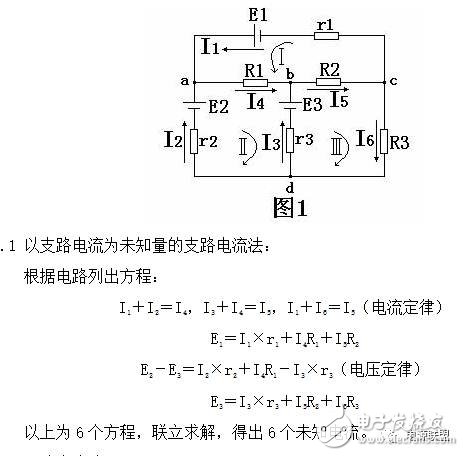 以圖1所示電路為例:來說明基爾霍夫定律在幾種解題方法上的應用,此電路有4個節(jié)點,三個網(wǎng)孔,6條支路。
