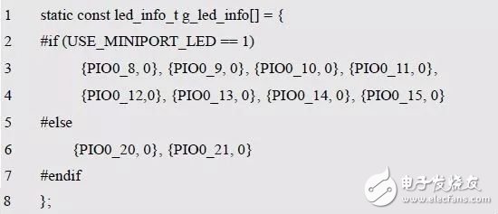 在實(shí)際的應(yīng)用中,用戶使用LED 有兩種情況,絕大部分情況都是使用AM824-Core 板載的兩個(gè)LED,但在流水燈實(shí)驗(yàn)中,使用的是MiniPort-LED 上的8 個(gè)LED,它們對(duì)應(yīng)的引腳是不同的,基于此,可以在led.h 文件中定義一個(gè)宏USE_MINIPORT_LED,默認(rèn)值為0,使用板載LED,為1 時(shí)使用MiniPort-LED。引腳信息數(shù)組g_led_info 的定義修改如下: