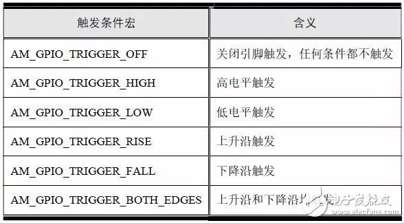 如果返回AM_OK,說(shuō)明配置成功,如果返回-AM_ENOTSUP,說(shuō)明引腳不支持該觸發(fā)條件,配置失敗,使用范例詳見(jiàn)程序清單5.17。