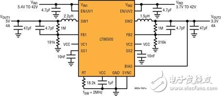 具低 EMI / EMC 輻射的雙 DC / DC 轉(zhuǎn)換器由于上述的應(yīng)用限制,凌力爾特公司 (最近已被 ADI 收購(gòu)) 開發(fā)了 LT8650S,這是一款能接受高輸入電壓的雙輸出單片同步降壓型轉(zhuǎn)換器,具很低的 EMI/EMC 輻射。其 3V 至 42V 輸入電壓范圍使該器件非常適合包括 ADAS 在內(nèi)的汽車應(yīng)用,汽車應(yīng)用必須穩(wěn)定通過最低輸入電壓低至 3V 的冷車發(fā)動(dòng)和停-啟情況、以及超過 40V 的負(fù)載突降瞬態(tài)。正如在圖 1 中能看到的那樣,這是一款雙通道設(shè)計(jì),由兩個(gè)高壓 4A 通道組成,提供低至 0.8V 的電壓,從而使該器件能夠驅(qū)動(dòng)目前可用和電壓最低的微處理器內(nèi)核。其同步整流拓?fù)湓?2MHz 開關(guān)頻率時(shí)提供高達(dá) 94.4% 的效率,而突發(fā)模式 Burst Mode?) 運(yùn)行在無負(fù)載備用條件下保持靜態(tài)電流低于 6.2μA (兩個(gè)通道都接通),從而使該器件非常適合始終保持接通系統(tǒng)。