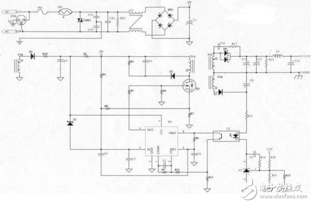 3843是PWM IC的一種,由Photo Coupler (U2)回授信號(hào)控制Duty Cycle的大小,Pin3腳具有限流的作用(最高電壓1V),目前所用的3843中,有KA3843(SAMSUNG)及UC3843BN(S.T.)兩種,兩者腳位相同,但產(chǎn)生的振蕩頻率略有差異,UC3843BN較KA3843快了約2KHz,fT的增加會(huì)衍生出一些問(wèn)題(例如:EMI問(wèn)題、短路問(wèn)題),因KA3843較難買,所以新機(jī)種設(shè)計(jì)時(shí),盡量使用UC3843BN。