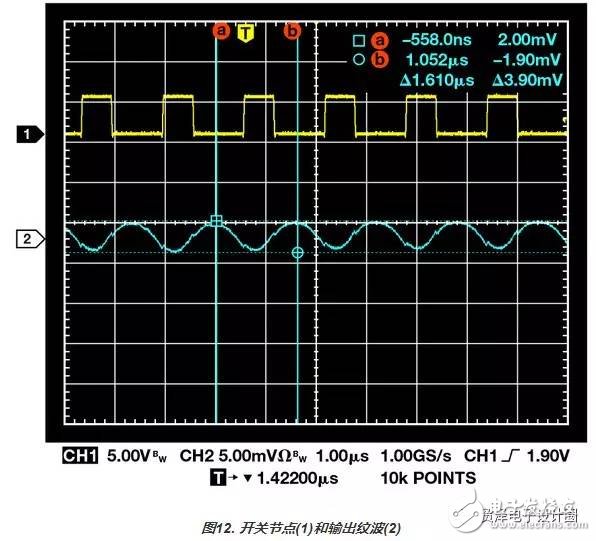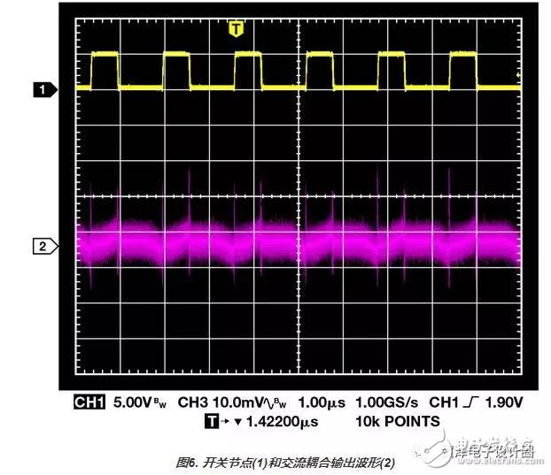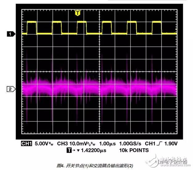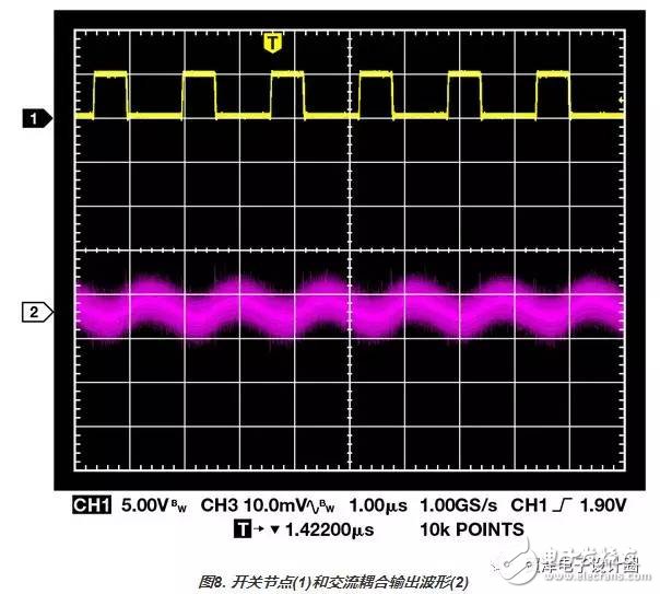 圖8. 開關(guān)節(jié)點(diǎn)(1)和交流耦合輸出波形(2) 最佳方法