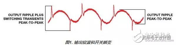 輸出紋波和開關(guān)瞬變?nèi)Q于調(diào)節(jié)器拓?fù)湟约巴獠?a target="_blank">元器件的數(shù)值與特性。輸出紋波是殘余交流輸出電壓,與調(diào)節(jié)器的開關(guān)操作密切相關(guān)。其基頻與調(diào)節(jié)器的開關(guān)頻率相同。開關(guān)瞬變是在開關(guān)轉(zhuǎn)換過程中發(fā)生的高頻振蕩。它們的幅度以最大峰峰值電壓表示,該值很難精確測(cè)量,因?yàn)樗c測(cè)試設(shè)置高度相關(guān)。圖1顯示輸出紋波和開關(guān)瞬變示例。