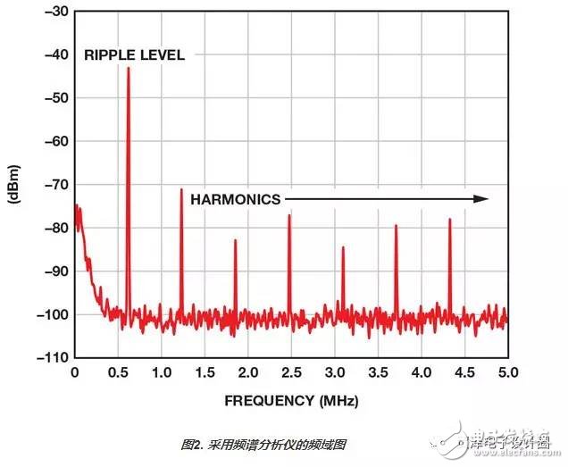 對(duì)電源工程師而言,測(cè)量不需要的輸出信號(hào)時(shí),考慮頻率域是非常有用的,它能提供一種更好的視角,了解輸出紋波及其諧波位于哪些離散頻率,以及各自對(duì)應(yīng)哪些不同的功率水平。圖2顯示的是一個(gè)頻譜的例子。這類信息可幫助工程師確定所選開關(guān)調(diào)節(jié)器是否適合其寬帶RF或高速轉(zhuǎn)換器應(yīng)用。