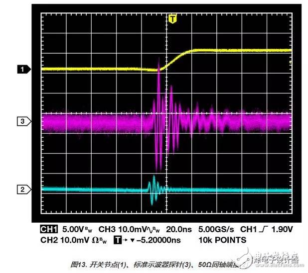 開關(guān)瞬變的能量較低,但是頻率成分比輸出紋波高。這種情況會(huì)在開關(guān)轉(zhuǎn)換過程中發(fā)生,通常標(biāo)準(zhǔn)化為包含紋波的峰峰值。圖13顯示使用帶有長(zhǎng)接地引線的標(biāo)準(zhǔn)示波器探針與使用50Ω同軸端接電纜(500 MHz帶寬)的開關(guān)瞬變測(cè)量結(jié)果對(duì)比。通常,由長(zhǎng)接地引線造成的接地環(huán)路會(huì)產(chǎn)生比預(yù)期更高的開關(guān)瞬變。