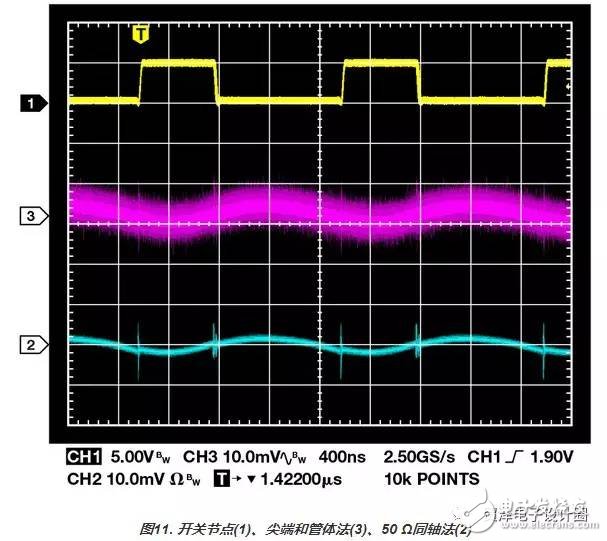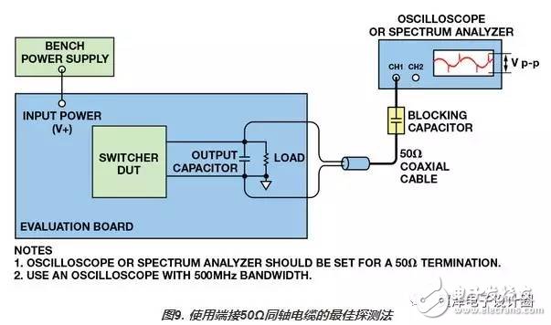 探測(cè)開關(guān)輸出的最佳方法是使用50Ω同軸電纜,該電纜維持在50Ω環(huán)境下,并通過可選50Ω示波器輸入阻抗端接。在調(diào)節(jié)器輸出電容和示波器輸入之間放置一個(gè)電容,可阻止直流電流通過。電纜的另一端可通過非常短的飛線直接焊接到輸出電容上,如圖9和圖10所示。這樣可以在寬帶寬范圍內(nèi)測(cè)量極低電平信號(hào)時(shí)保持信號(hào)完整性。圖11顯示500 MHz測(cè)量帶寬下,用尖端和管體法與50Ω同軸法在輸出電容端進(jìn)行探測(cè)的對(duì)比。