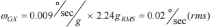 利用公式通過線性加速度參數(shù)乘以ASDF (f)曲線幅值2.24grms,可估算產生的噪聲電平為0.02°/s (rms)。此噪聲電平比通過公式5到的0.045°/s (rms)低55%,利用公式的方法未采用頻譜項評估此噪聲源。這種改善是采用頻譜項定義振動曲線以獲取值的一個示例。