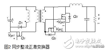 圖2為同步整流正激變換器,Q 2為整流管,Q 3為續(xù)流管。當(dāng)變壓器原邊主開關(guān)管Q 1導(dǎo)通時,副邊電流流過Q 2的體二極管,使V gs3=0,Q 3截止,V gs3=V2,Q 2導(dǎo)通;反之,當(dāng)主開關(guān)管Q 1截止時,Q 2截止,Q 3續(xù)流。由于功率MOSFET 的寄生電容與開關(guān)電容損耗并存,特別是在高頻時,門極驅(qū)動損耗可能較大,現(xiàn)在的同步整流技術(shù)都在努力實現(xiàn)ZVS 、ZCS 方式2的同步整流,并將有源箝位技術(shù)與之結(jié)合,進一步降低了MOSFET 的開關(guān)損耗,近年來取得了重大進步,主要有以下幾個方面[13]:(1)開發(fā)出適用于對稱拓撲(推挽、半橋和全橋) 的ZVS 、ZCS 同步整流電路,將最高效率提高到了95%;(2)將數(shù)字技術(shù)結(jié)合到同步整流技術(shù)中。采取檢測同步MOSFET 管的開關(guān)狀態(tài),經(jīng)過DSP 運算,得到下一開關(guān)周期實現(xiàn)ZVS 的最佳開關(guān)時間,突破性地做出了正激ZVS 同步整流電路;(3)使用復(fù)合拓撲使同步整流效率更佳。