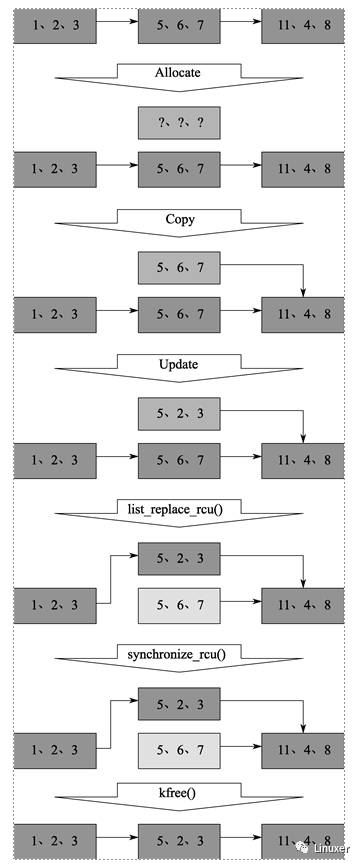 不過盡管RCU是因替換的例子而得名的,但是RCU在內(nèi)核中的主要用途還是用于簡(jiǎn)單的刪除。