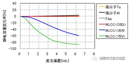 直流偏置特性是指,對電容器施加直流電壓時實際靜電容量發(fā)生變化(減少)的現(xiàn)象。這種現(xiàn)象是使用了鈦酸鋇系鐵電體的高介電常數(shù)類片狀多層陶瓷電容器特有的現(xiàn)象,導(dǎo)電性高分子的鋁電解電容器(高分子AI)和導(dǎo)電性高分子鉭電解電容器(高分子Ta)、薄膜電容器(Film)、氧化鈦和使用了鋯酸鈣系順電體的溫度補償用片狀多層陶瓷電容器(MLCC