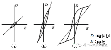 如上所述,鐵電體陶瓷的結(jié)晶粒(Grain)有分域(Domain),各個自發(fā)極化(Ps)的方向是隨機的,整體上相當于無極化的狀態(tài)。在此之上施加電場(E)時,電場方向上產(chǎn)生極化,達到飽和值。在這種狀態(tài)下即使去除電場,極化方向也不會回到原來無序隨機的狀態(tài),多少會停留在極化時的狀態(tài)上,形成殘留極化,在外部顯現(xiàn)。為了讓這種殘留極化歸零,需要反方向的電場。逆電場進一步增強時會發(fā)生極化反轉(zhuǎn),向相反方向進行極化。類似這樣的因外部電場而引起的鐵電體的極化動作如圖4的D-E歷史曲線(磁滯曲線)。