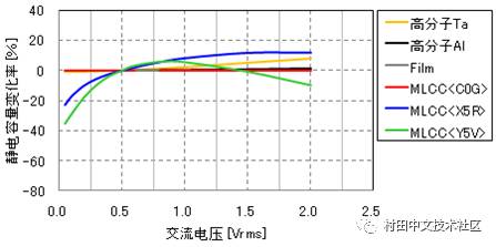 圖3:各種電容器的靜電容量變化率-交流電壓特性(示例)