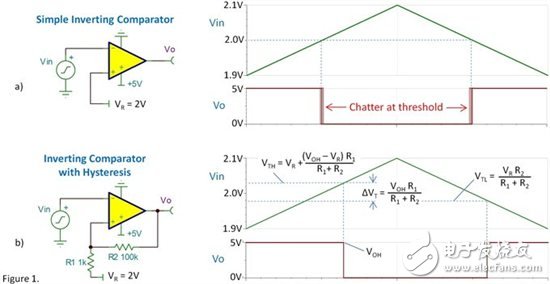 在圖1b中,R1和R2在輸出端形成了一個分壓器 - 正反饋切換門限電壓從而形成遲滯。當一個上升的輸入電壓達到比較電壓時候,Vo的下降沿將使門限電壓移動到一個較低的電壓值,從而避免噪聲引起振蕩。