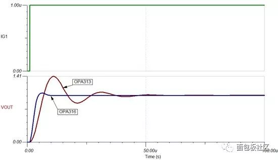 降低的相位裕度還會產(chǎn)生其它影響。例如,它可導(dǎo)致電路階躍響應(yīng)中的過沖和振鈴問題。為說明這種影響,我使用瞬態(tài)仿真在電路輸入端應(yīng)用了 1uA 電流階躍 (IG1),并測量了趨穩(wěn)到 0.1% 理想值所需的時間。