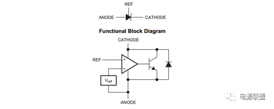 由圖可以看到,VI是一個(gè)內(nèi)部的2.5V基準(zhǔn)源,接在運(yùn)放的反相輸入端。由運(yùn)放的特性可知,只有當(dāng)REF端(同相端)的電壓非常接近VI(2.5V)時(shí),三極管中才會(huì)有一個(gè)穩(wěn)定的非飽和電流通過,而且隨著REF端電壓的微小變化,通過三極管的電流將從1到100mA變化。當(dāng)然,該圖絕不是TL431的實(shí)際內(nèi)部結(jié)構(gòu),所以不能簡單地用這種組合來代替它。但如果在設(shè)計(jì)、分析應(yīng)用TL431的電路時(shí),這個(gè)模塊圖對開啟思路,理解電路都是很有幫助的。