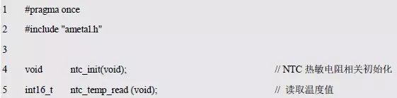 如程序清單5.92 所示的ntc.c 的兩個函數(shù),其中的一個用于初始化,另一個用于讀取電壓值。由于最終的接口還不確定,所以只創(chuàng)建了ntc.h。