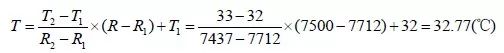 對于上述例子來說,若測得電阻阻值為7500Ω,則區(qū)間的兩個端點為(7712,32)和(7437,33),使用上述式子可得到溫度值: