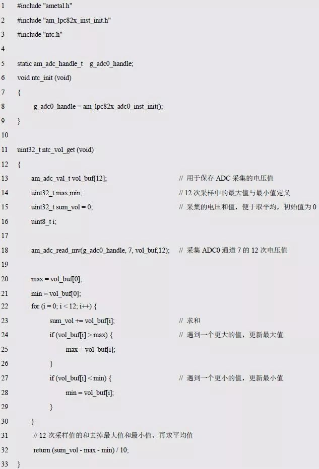 ntc_init()僅用于初始化ADC,獲取一個標準的ADC 實例句柄。ntc_vol_get()用于獲取ADC 通道7 對應的電壓值,使用了am_adc_read_mv()函數(shù)。