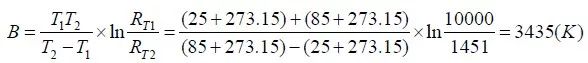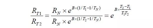 如何得到材料常數(shù)B 的值呢?顯然,只能通過實驗測得。假定在實驗環(huán)境下,測得在溫度 T1 ( K )時的零功率電阻值為RT1,在溫度 T2 ( K )時的零功率電阻值為RT2。零功率電阻是指在某一溫度下測量熱敏電阻值時,加在熱敏電阻上的功耗極低,低到因其功耗引起的熱敏電阻阻值變化可以忽略不計。額定零功率電阻是在環(huán)境溫度25℃條件下測得的零功率電阻值,標記為R25,通常所說NTC 熱敏電阻阻值就是指該值。