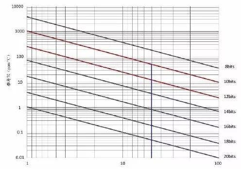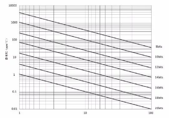 如圖5.5 所示是一個十分有用的速查工具,它以25℃為變化基準,溫度在1℃~00℃變化時,8~20 位ADC 在1LSB 分辨精度的要求下,將所需基準的TC 值繪制成圖,由該圖表可迅速查得所需的TC 值。