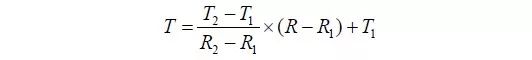 盡管指數(shù)關(guān)系是非線性關(guān)系,其對應的阻值-溫度關(guān)系圖是曲線圖,但可以將這一曲線分解為若干小段,將每一小段中的阻值-溫度關(guān)系近似為線性關(guān)系。如將1℃溫度區(qū)間內(nèi)的阻值-溫度關(guān)系近似為線性關(guān)系進行處理。假設(shè)已知區(qū)間的兩個端點(R1,T1)、(R2,T2),那么使用已知兩點求直線方程的方法,很容易得到阻值R(R1≤R≤R2)對應的溫度為: