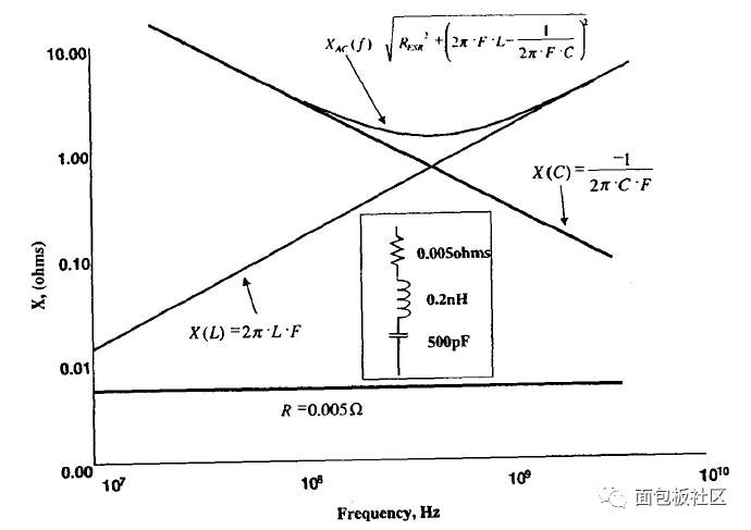 用等效交流阻抗來評(píng)估一個(gè)去耦電容的優(yōu)劣,等效交流阻抗用電阻、電感和電容阻抗的均方根值來近似:ohms