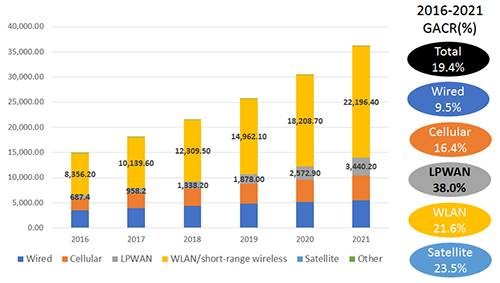 WLAN仍是主流聯(lián)網(wǎng)技術(shù) LPWAN則為后起之秀IDC預(yù)估,全球的聯(lián)網(wǎng)裝置數(shù)量將從2016年的148.7億個成長到2021年的361.3億個,年復(fù)合成長率為19.4%。