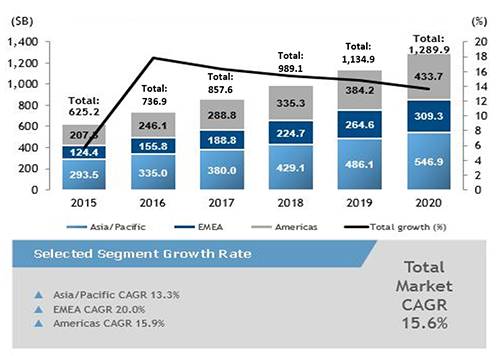 若是從年復(fù)合成長率這個角度來看,則是以EMEA(歐洲/中東/非洲)市場的成長力道最為強(qiáng)勁,年復(fù)合成長率達(dá)20%,如圖2。