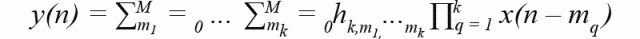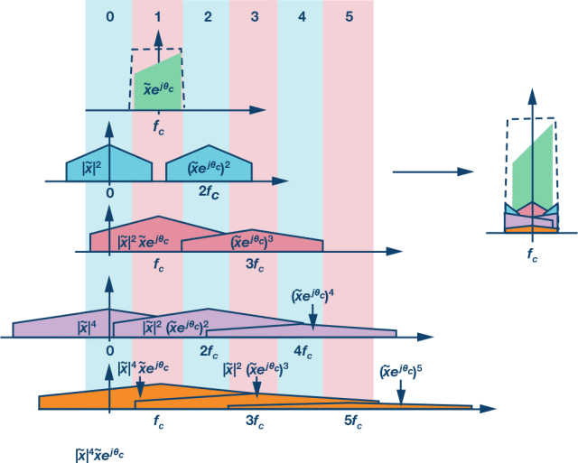 可將其理解為有記憶效應(yīng)的Taylor冪級數(shù)的推廣。值得注意的是,每個非線性項(k = 1,2, … , K)都會產(chǎn)生多個諧波失真(HD)產(chǎn)物。例如,五階有3個諧波項:一次諧波、三次諧波和五次諧波。另外需要注意的是,諧波帶寬是其階次的倍數(shù)。例如,三階諧波項的寬度是激勵帶寬的3倍。