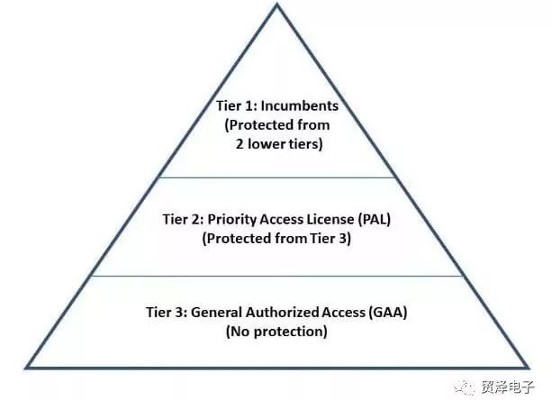 CBRS的頻譜與載波LTE、3550到3700MHz的150MHz帶寬的連續(xù)頻譜共享一個三層的結構(如圖1所示)。不要覺得150MHz太小,想一想,全部無線載波加起來不過130MHz。三層設計意味著現(xiàn)有的一級服務(例如美國海軍雷達和固定衛(wèi)星地球站)優(yōu)先于其他兩個類別,優(yōu)先級由高到低依次是優(yōu)先訪問許可證(PAL)用戶和一般授權訪問(GAA)用戶。