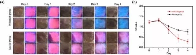 他們利用這一獨(dú)特的性質(zhì)建立了比率熒光監(jiān)測創(chuàng)口感染的新方法。通常被微生物感染的慢性傷口ROS和pH值會(huì)顯著升高。此外,由于感染而導(dǎo)致的細(xì)胞DNA釋放還會(huì)引起傷口PO43-的增加。這些綜合因素使藥物—多孔硅體系在感染創(chuàng)口中的熒光變色速率顯著高于急性傷口(圖2),同時(shí)藥物釋放與熒光變色完全協(xié)同,達(dá)到了診療一體化的目的。