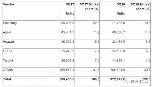 據(jù)Gartner的統(tǒng)計(jì),2017年第三季,三星的智能手機(jī)銷售數(shù)量為8560萬(wàn)部,全球市場(chǎng)份額22.3%,銷售量列全球之首;蘋(píng)果智能手機(jī)銷量4544萬(wàn)部,全球市場(chǎng)份額11.9%,名列第二;第三名為華為,智能手機(jī)銷量3650萬(wàn)部,全球市場(chǎng)份額9.5%。