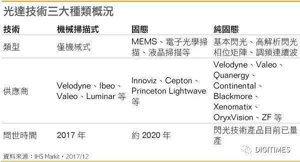 現(xiàn)階段全球光達(dá)技術(shù)分為機(jī)械式、固態(tài)及純固態(tài)三種,固態(tài)及純固態(tài)又分為好幾種技術(shù)類型,但光達(dá)制造商仍無(wú)特別鎖定某類技術(shù)發(fā)展,如Velodyne及Valeo均從事于機(jī)械及純固態(tài)光達(dá)技術(shù)開(kāi)發(fā)。