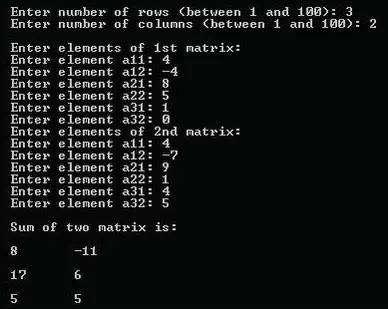#includeint main(){ int r,c,a[100][100],b[100][100],sum[100][100],i,j; printf("Enter number of rows (between 1 and 100): "); scanf("%d",&r); printf("Enter number of columns (between 1 and 100): "); scanf("%d",&c); printf("\nEnter elements of 1st matrix:\n"); /* Storing elements of first matrix entered by user. */ for(i=0;i 結(jié)果輸出: