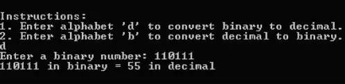 /* C programming source code to convert either binary to decimal or decimal to binary according to data entered by user. */ #include#include int binary_decimal(int n); int decimal_binary(int n); int main() { int n; char c; printf("Instructions:\n"); printf("1. Enter alphabet 'd' to convert binary to decimal.\n"); printf("2. Enter alphabet 'b' to convert decimal to binary.\n"); scanf("%c",&c); if (c =='d' || c == 'D') { printf("Enter a binary number: "); scanf("%d", &n); printf("%d in binary = %d in decimal", n, binary_decimal(n)); } if (c =='b' || c == 'B') { printf("Enter a decimal number: "); scanf("%d", &n); printf("%d in decimal = %d in binary", n, decimal_binary(n)); } return 0; } int decimal_binary(int n) /* Function to convert decimal to binary.*/ { int rem, i=1, binary=0; while (n!=0) { rem=n%2; n/=2; binary+=rem*i; i*=10; } return binary; } int binary_decimal(int n) /* Function to convert binary to decimal.*/ { int decimal=0, i=0, rem; while (n!=0) { rem = n%10; n/=10; decimal += rem*pow(2,i); ++i; } return decimal; } 結(jié)果輸出: