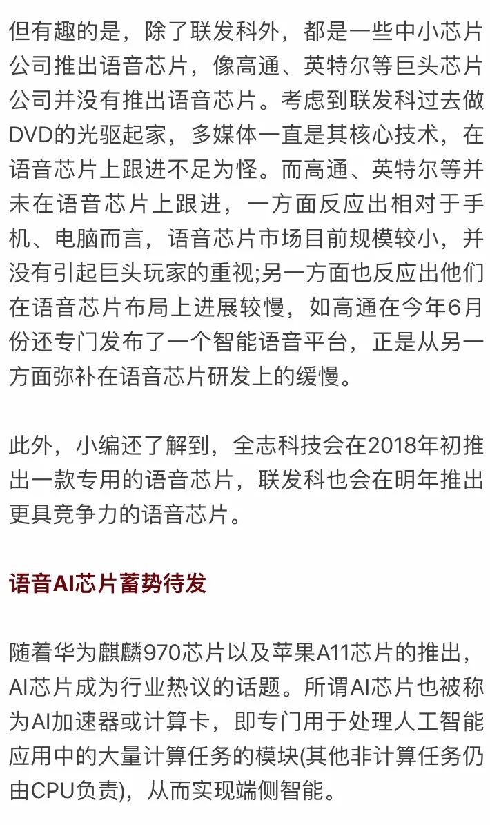 可以預見的是,2018年會有更多語音芯片的誕生,在未來1~2年,語音AI芯片也將進一步發(fā)展迎來爆發(fā)期。