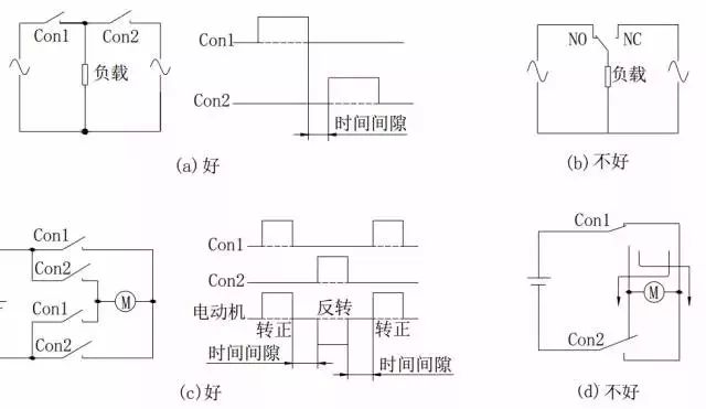 應避免因觸點粘接、電弧導致的短路在電路中,應考慮以幾點(參見圖 4):1) 一般繼電器的觸點間隙都比較小,應考慮到可能由于觸點間電弧引起短路的情況。請不要使用圖 4(b)的電路。推薦使用圖 4(a)所示電路,并在觸點 Con1 和 Con2 動作之間設定一定的間隔時間。2)應該考慮在觸點間粘接或錯誤動作造成短路時,也不應產生過電流,造成電路超負荷或燒損。3)注意不要使用圖 4(d)所示的用兩組轉換觸點構成電動機正、逆轉電路。推薦使用圖 4(c)所示電路,并在觸點 Con1 和 Con2 動作之間投定一定的間隔時間。