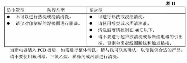 5.7.5 冷卻自動焊接之后,為了避免因焊接時的熱量使繼電器或其它部件老化,請在焊接后立即通風冷卻。塑封型繼電器雖然能夠進行清洗,但在剛焊接完成時,請不要將繼電器立即送去清洗,因為突然接觸較涼的清洗液可能會損壞繼電器內部的密封性。5.7.6 清洗清洗時請閱表 11 選擇清洗方法。