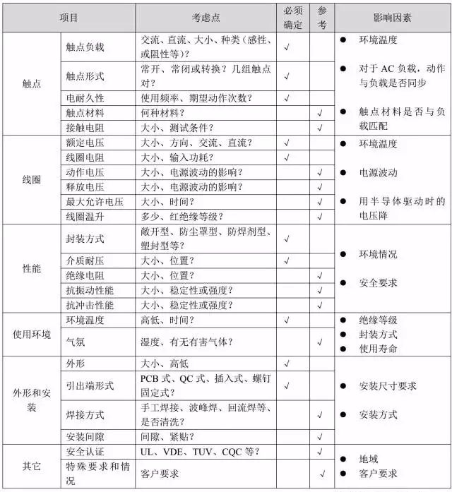 為了正確的選用繼電器,需要了解繼電器的特性,確認這些特性是否符合使用要求,如能在實際使環(huán)境中進行確認則更為可靠。繼電器的選用原則參見表 1,在表中“必須確定”欄中有“”號的項目被確定之后,就可選定一款繼電器。如果有進一步的要求,需要進一步考慮“參考”欄中有“”號的相應項目。