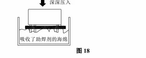 5.7.2 涂抹助焊劑助焊劑請使用非腐蝕性的松香類系列,溶劑請使用化學作用較少的酒精。請薄而均勻的涂抹助焊劑,以防止其浸入繼電器內部。對于蘸式涂抹,請保持助焊劑液面穩(wěn)定。請調整位置使助焊劑不會溢到印制板的上面。請注意不要使助焊劑附著在繼電器端子以外的部位,這樣可能導致繼電器的絕緣降低。請注意對于防塵罩和防焊劑型繼電器,不要使用將印制板從上方深深按入蘸有助焊劑的海棉里的涂抹方式,如圖 18 所示,這種方式會使助焊劑進入繼電器內部。特別要注意的是防塵罩型。