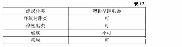 為了防止印制板的絕緣劣化,需要進行表面處理時請注意以下事項。防塵罩型及防焊劑型,會因為表面處理劑進入繼電器內部導致發(fā)生故障,因此請不要進行表面處理,或在表面處理之后再安裝繼電器。由于某此表面處理劑對繼電器有不良影響,如溶解外殼等,因此請認真選擇、并在實際使用時時行試驗確認。表面處理劑的溫度請不要超過繼電器最高的使用溫度,而且請在繼電器冷至常溫時,才能噴涂表面處理劑。關于涂層有以下建議,見表 12.
