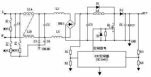 輸入電壓經(jīng)L1、L2、L3等組成的EMI濾波器,BRG1整流一路送PFC電感,另一路經(jīng)R1、R2分壓后送入PFC控制器作為輸入電壓的取樣,用以調(diào)整控制信號的占空比,即改變Q1的導通和關斷時間,穩(wěn)定PFC輸出電壓。L4是PFC電感,它在Q1導通時儲存能量,在Q1關斷時施放能量。D1是啟動二極管。D2是PFC整流二極管,C6、C7濾波。PFC電壓一路送后級電路,另一路經(jīng)R3、R4分壓后送入PFC控制器作為PFC輸出電壓的取樣,用以調(diào)整控制信號的占空比,穩(wěn)定PFC輸出電壓。