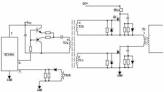 T2為驅(qū)動變壓器,T1為開關變壓器,TR1為電流環(huán)。