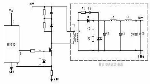 T1為開關變壓器,其初極和次極的相位同相。D1為整流二極管,D2為續(xù)流二極管,R1、C1、R2、C2為削尖峰電路。L1為續(xù)流電感,C4、L2、C5組成π型濾波器。