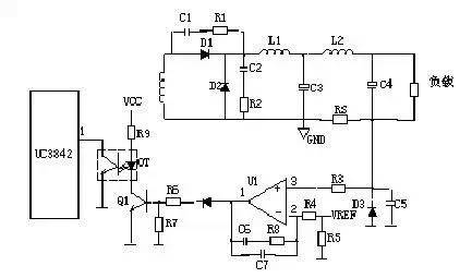 當輸出電路短路或過流,變壓器原邊電流增大,R3兩端電壓降增大,③腳電壓升高,UC3842⑥腳輸出占空比逐漸增大,③腳電壓超過1V時,UC3842關閉無輸出。