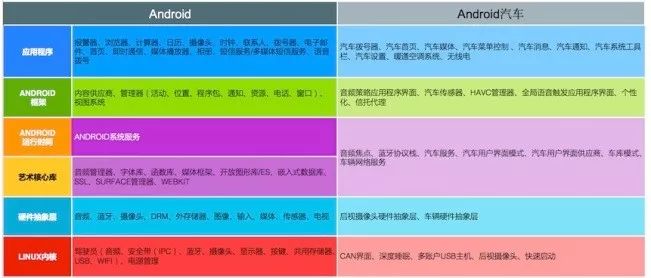 2015年開始,一些車廠開始使用安卓前裝車載的信息娛樂系統(tǒng),但當(dāng)時的安卓只有移動和平板兩個版本,各個廠家需要按需定制功能,在兼容性方面存在很大問題。2016年末,Android O、Android P新功能公布,在汽車方面涉及的模塊,如下表所示。